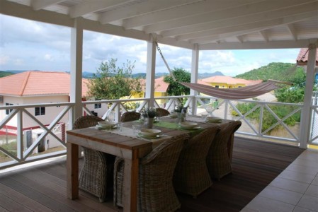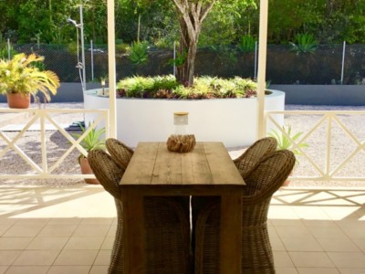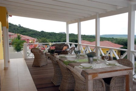 Die Terrasse ist sehr luftig komplett überdacht, was für reichlich Schatten und angenehme Temperaturen sorgt.